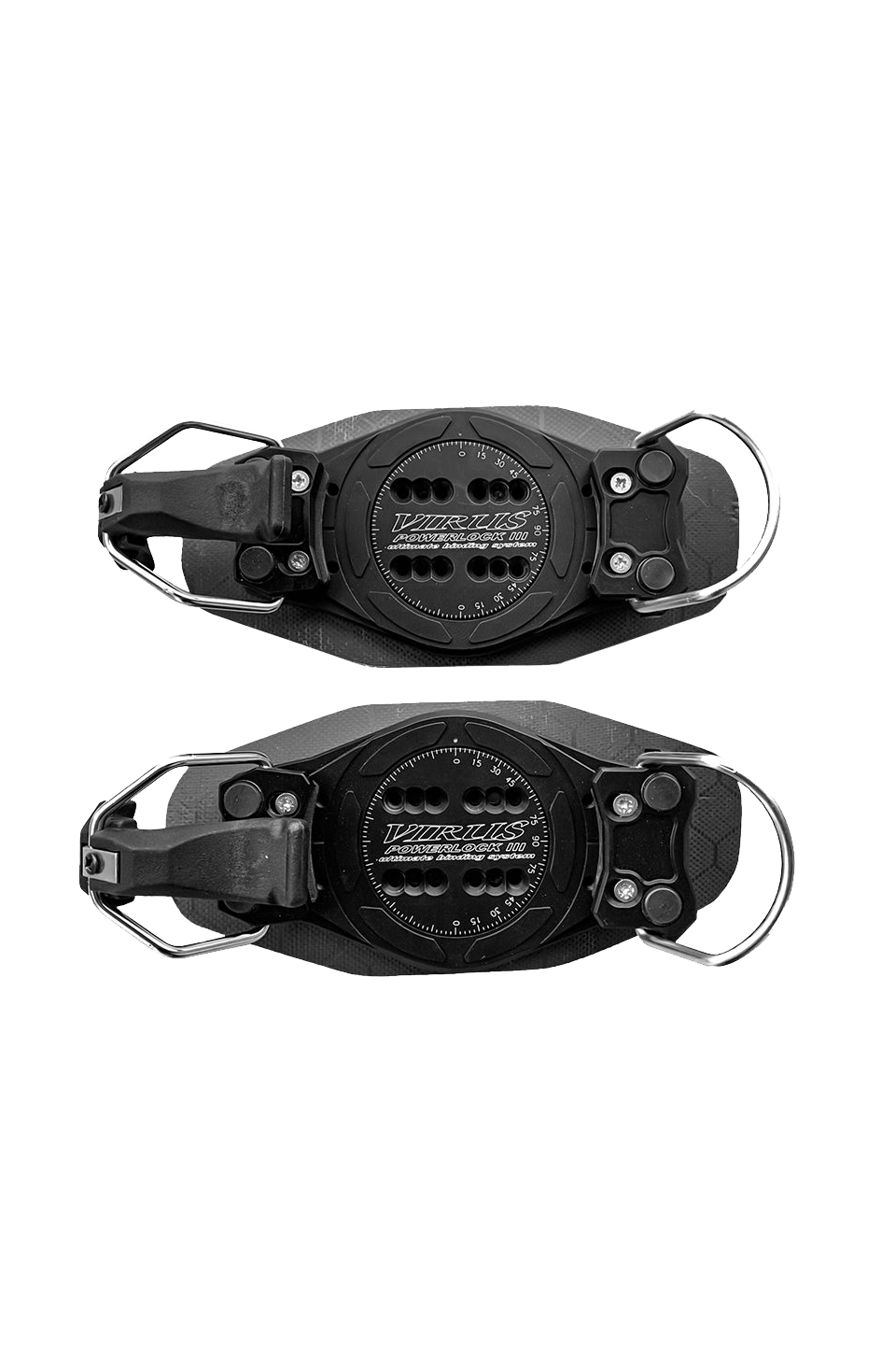Die VIRUS Powerlock III Snowboard Bindung ist eine der am weitesten entwickelten Snowboard Hardboot Bindungen auf dem Markt. Die Bindung wird aus Aircraft Grade Aluminium aus dem vollen Block gefräst. Bei der Bindung handelt sich um ein sogenanntes Freeflex System, das heißt die Bindung überträgt über einen Durchmesser von ca. 130 mm Durchmesser die Kraft auf das Board. Dadurch wird die Kontaktfläche der Bindung zum Board reduziert und das Board kann sich runder unter der Bindung durchbiegen. Gleichzeitig wir die Gefahr eines Stauchungsbruchs oder einer Stauchung des Boards, die am häufigsten vorkommende Ursache eines Boards erheblich reduziert.