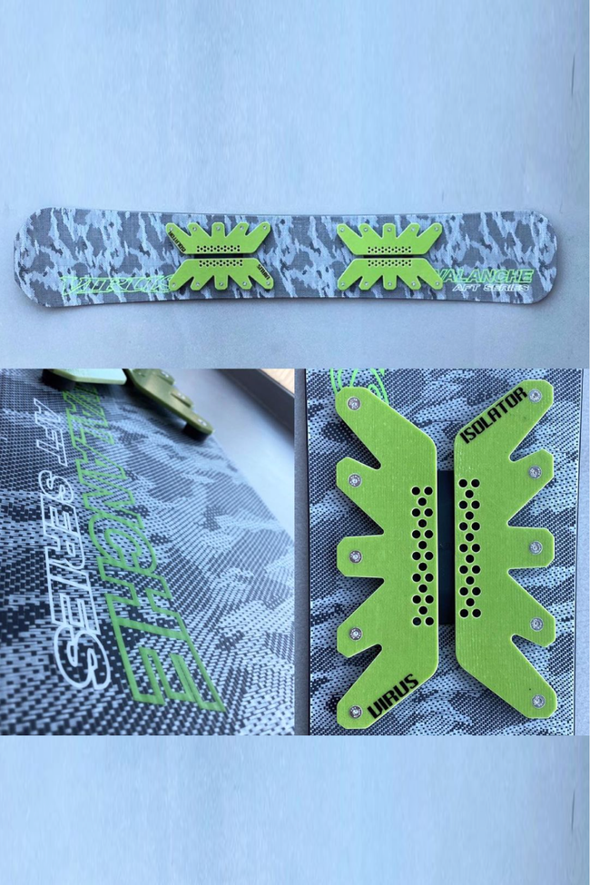 Die brandneue VIRUS ISOLATOR-Platte ist VIRUS's neuestes Bestreben, Ihr Carving-Erlebnis zu verbessern. Diese Platte ist mit fast allen Snowboards auf dem Markt kompatibel. Der ISOLATOR optimiert die Kraftverteilung auf dem Board, um deine Energie beim Carven zu sparen und dir ein ruhigeres Fahrgefühl zu ermöglichen. Und wenn Sie Ihre Haltung anheben, stört Sie das Ziehen der Ferse nicht mehr. Der ISOLATOR wird mit mehreren Gummipads mit unterschiedlichen Flexraten geliefert, sodass Sie die Steifigkeit Ihren Fahrpräferenzen anpassen können. ISOLATOR Standardausführung mit Glasfaseroberfläche. Etwa 1,2 kg pro Set (4 Stück). 5 mm Dicke für Softboot und 6 mm für Alpin. ISOLATOR Carbon Leichte Ausführung mit schwarzer Kohlefaser-Oberfläche. Etwa 1,3 kg pro Set (4 Stück). 5 mm Dicke für Softboot und 6 mm für Alpin. Wir empfehlen außerdem, das ISOLATOR Pad zu installieren, um eine Beschädigung Ihres Nicht-VIRUS-Boards zu verhindern. Diese Einheit schützt das Board, indem es seinen Bindungsbereich verstärkt.