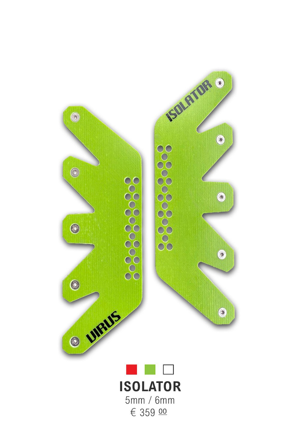 - VIRUS Isolator (this product): Standard version with glass-fiber surface. Around 1.2kg per set (4 pieces). 5mm thickness for soft boot and 6mm for alpine.